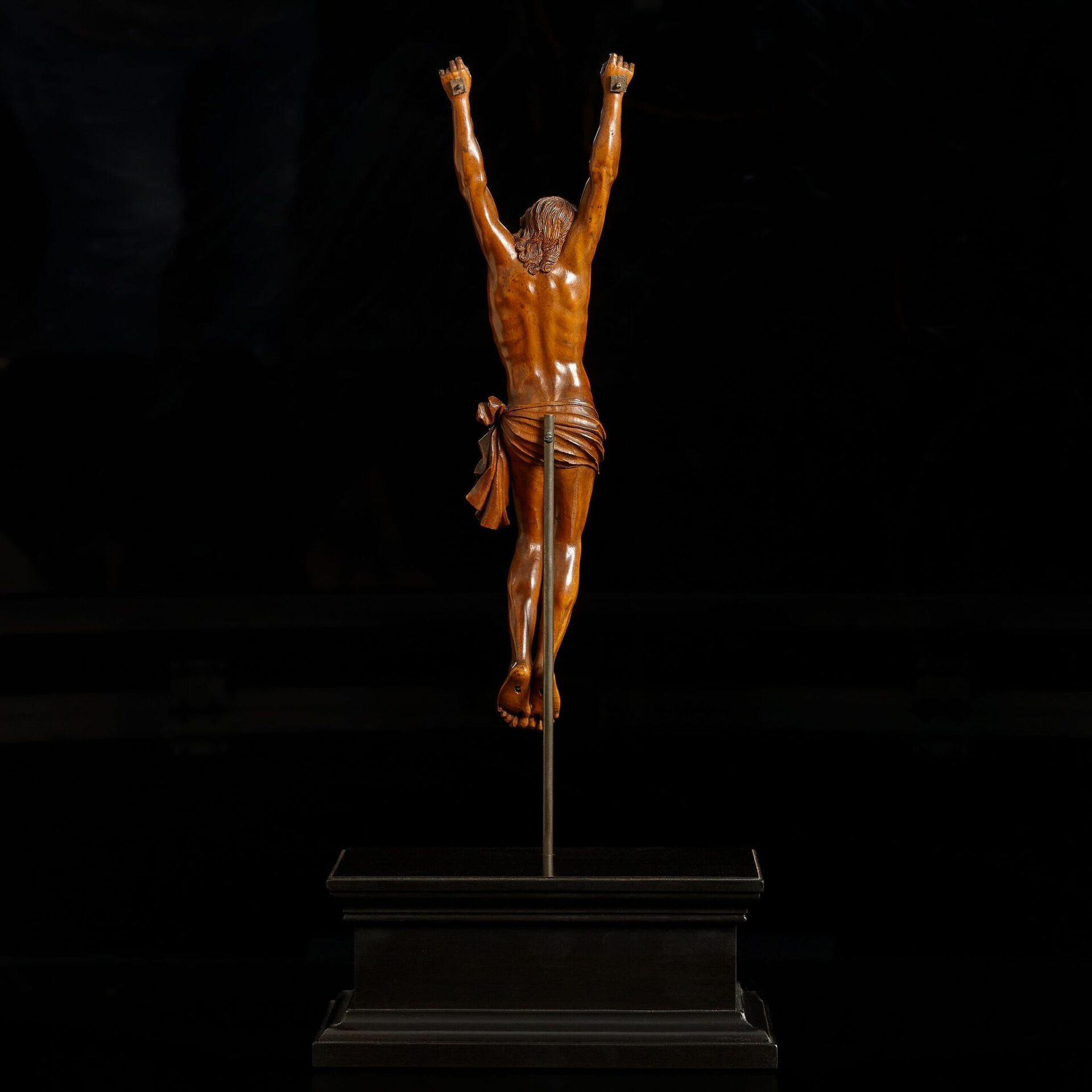 Houtsnijwerk Jansenistische Cristo Vivo. Bukshout, vol rond gesculpteerd. Op latere geëboniseerd voetstuk.