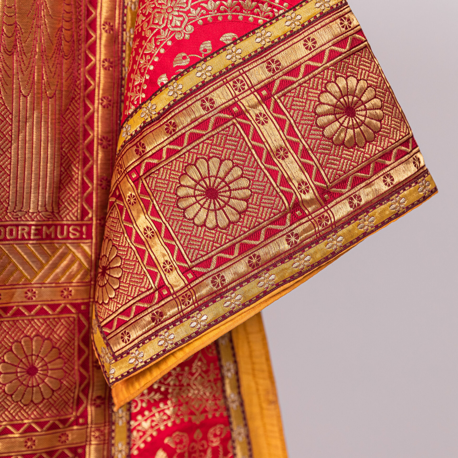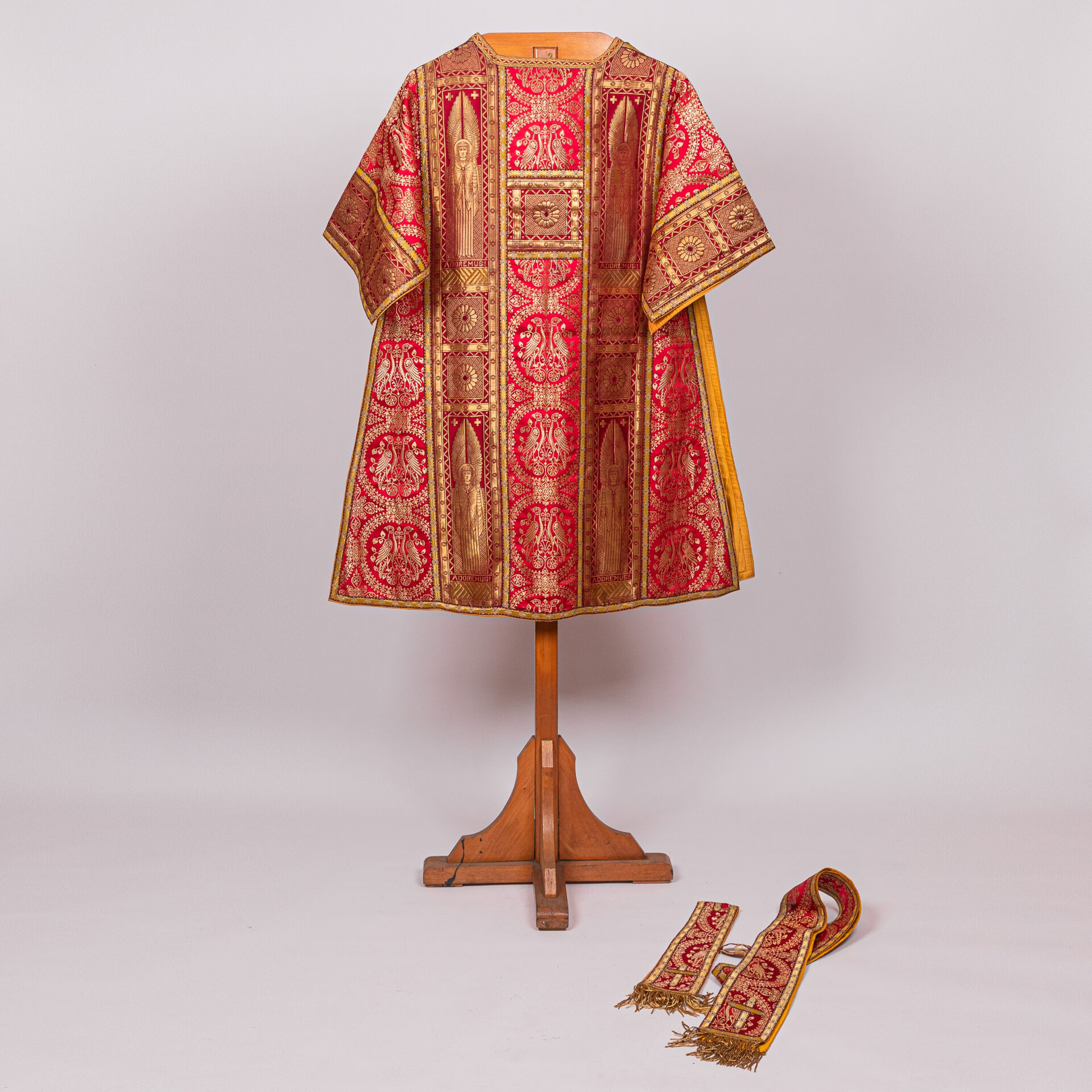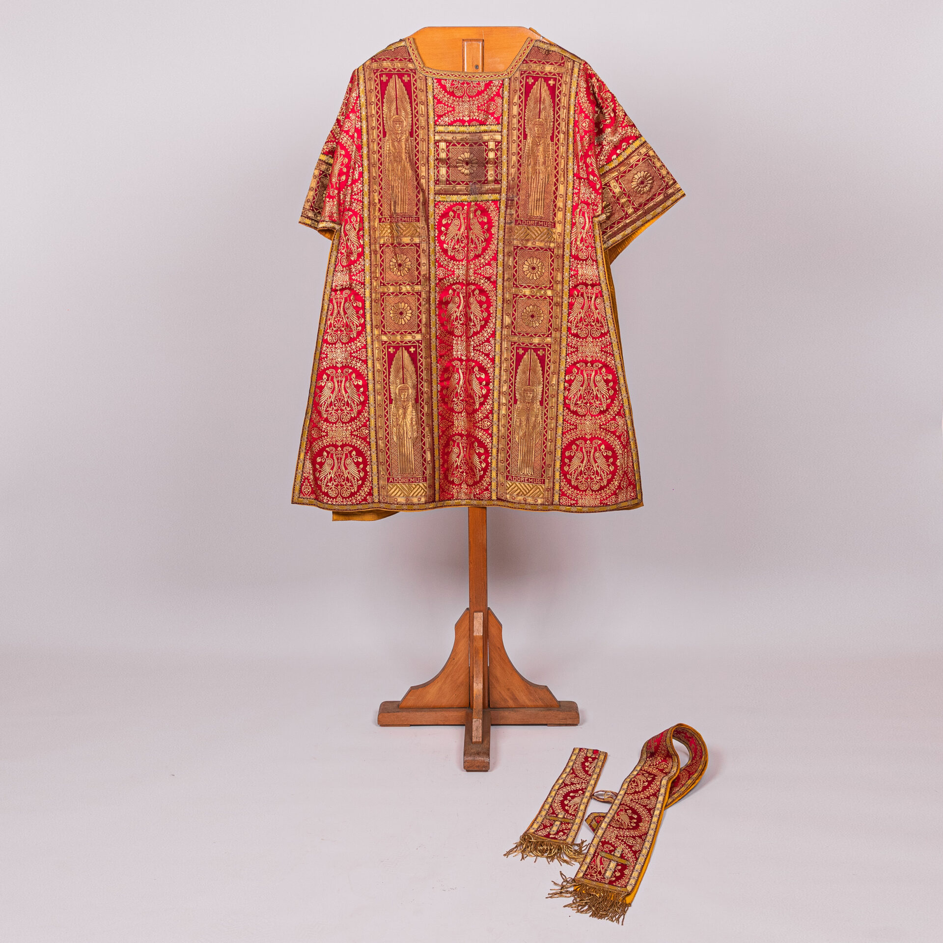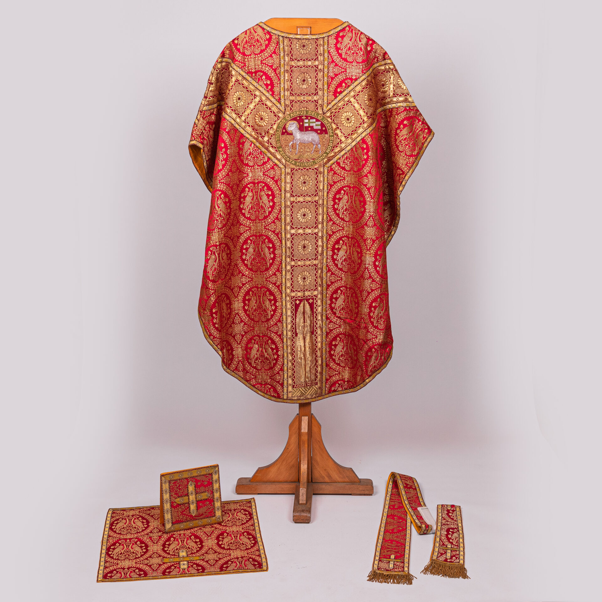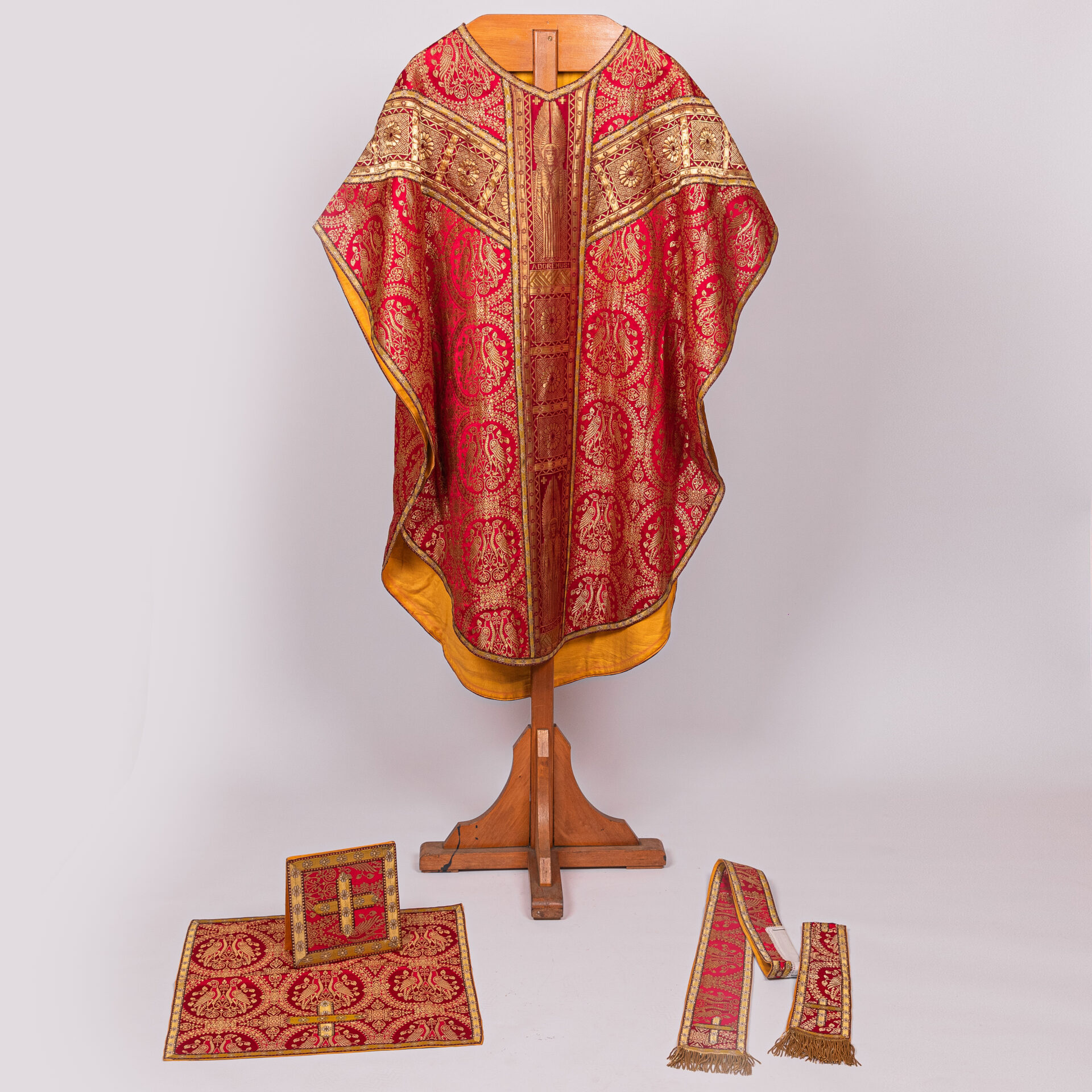 Kazuifel met 2 dalmatieken, 3 stolas, 3 manipels en bursa en velum