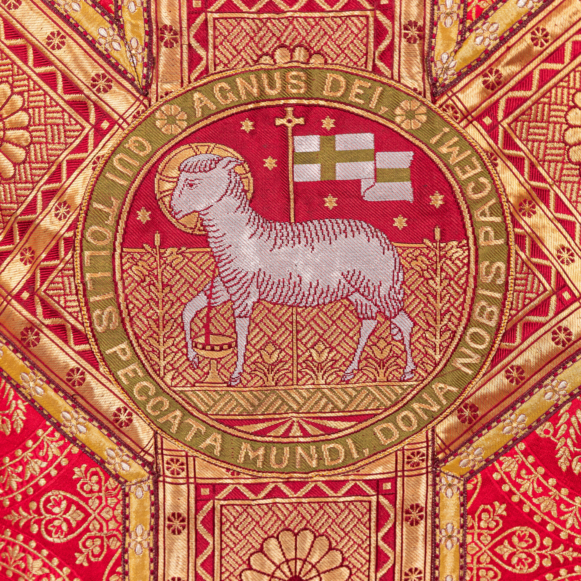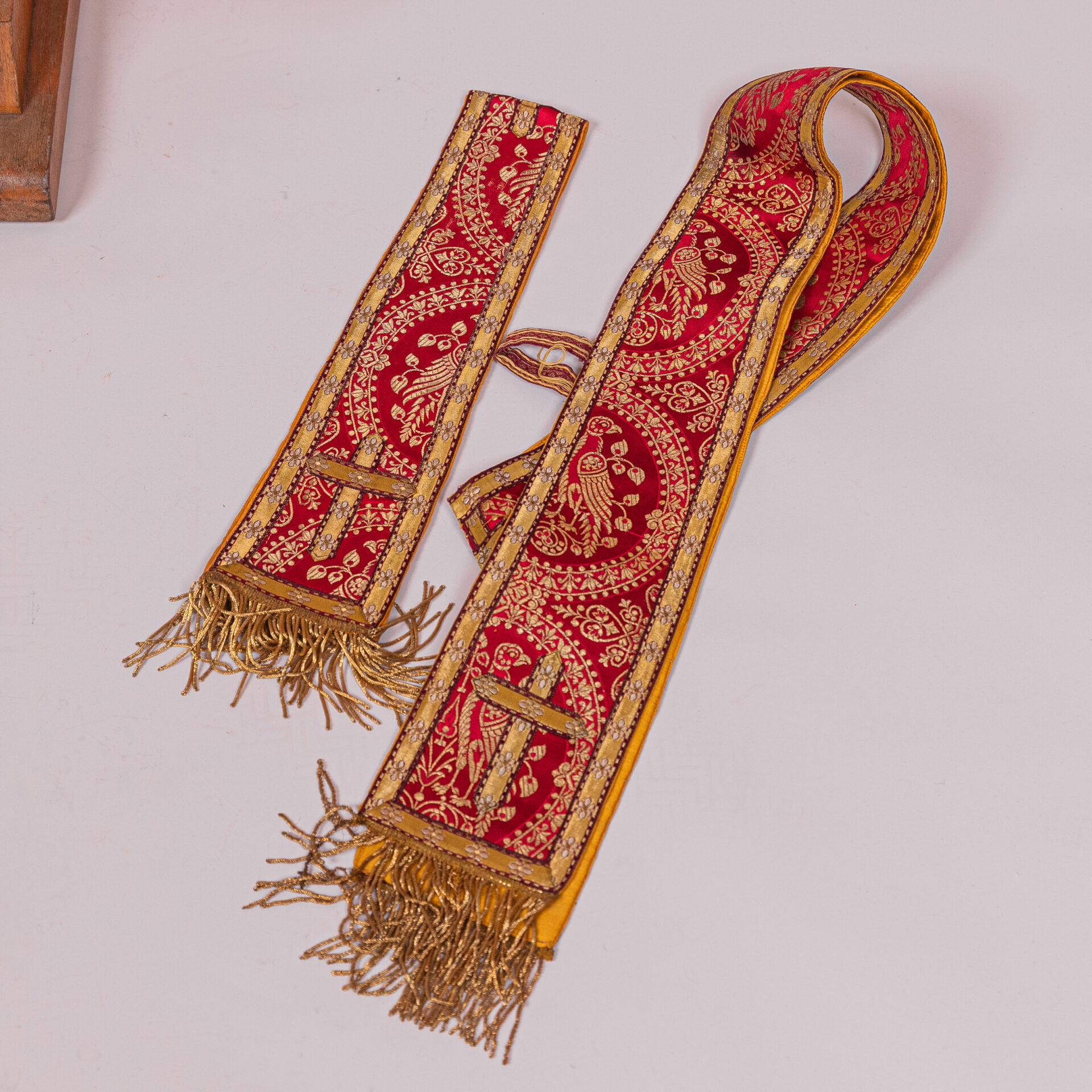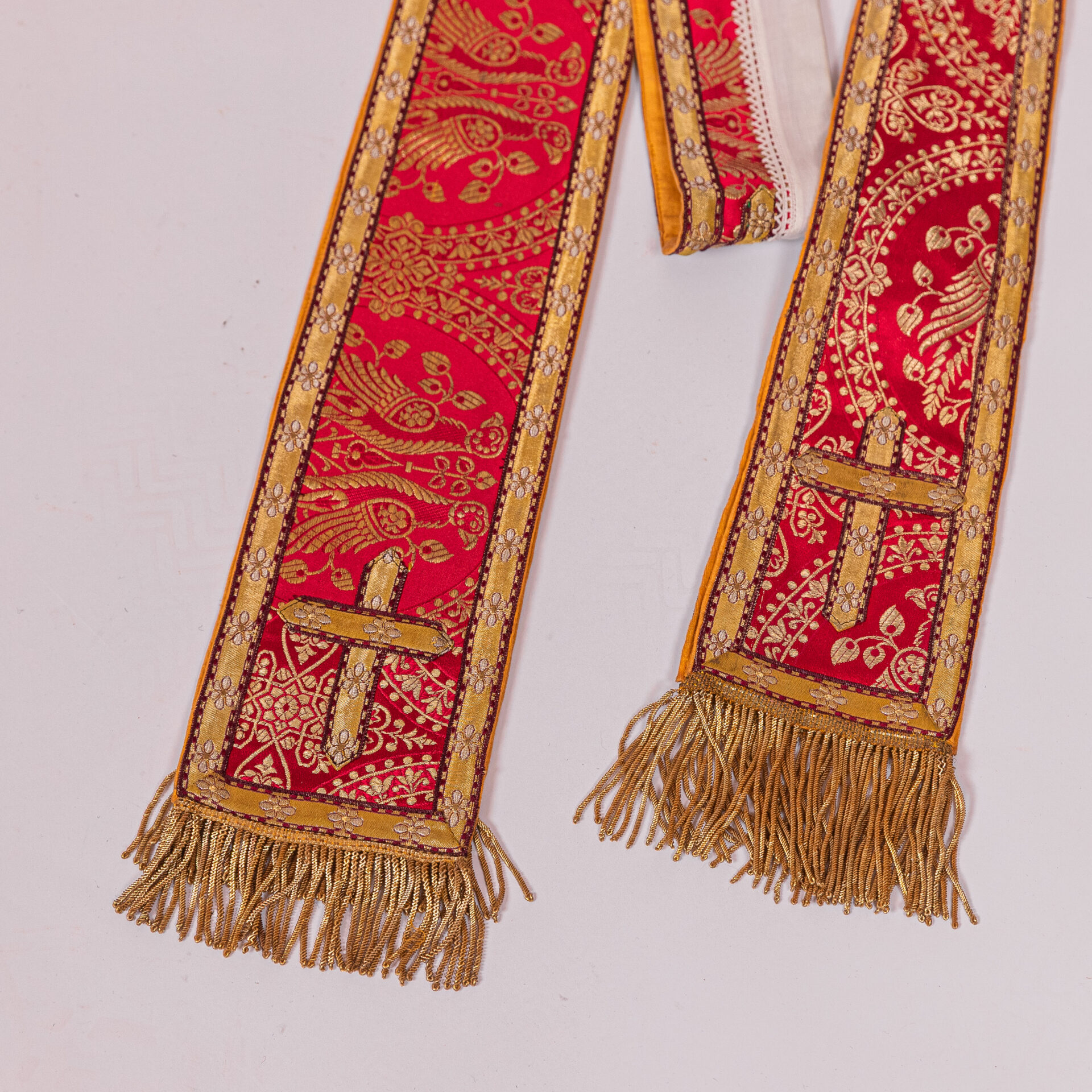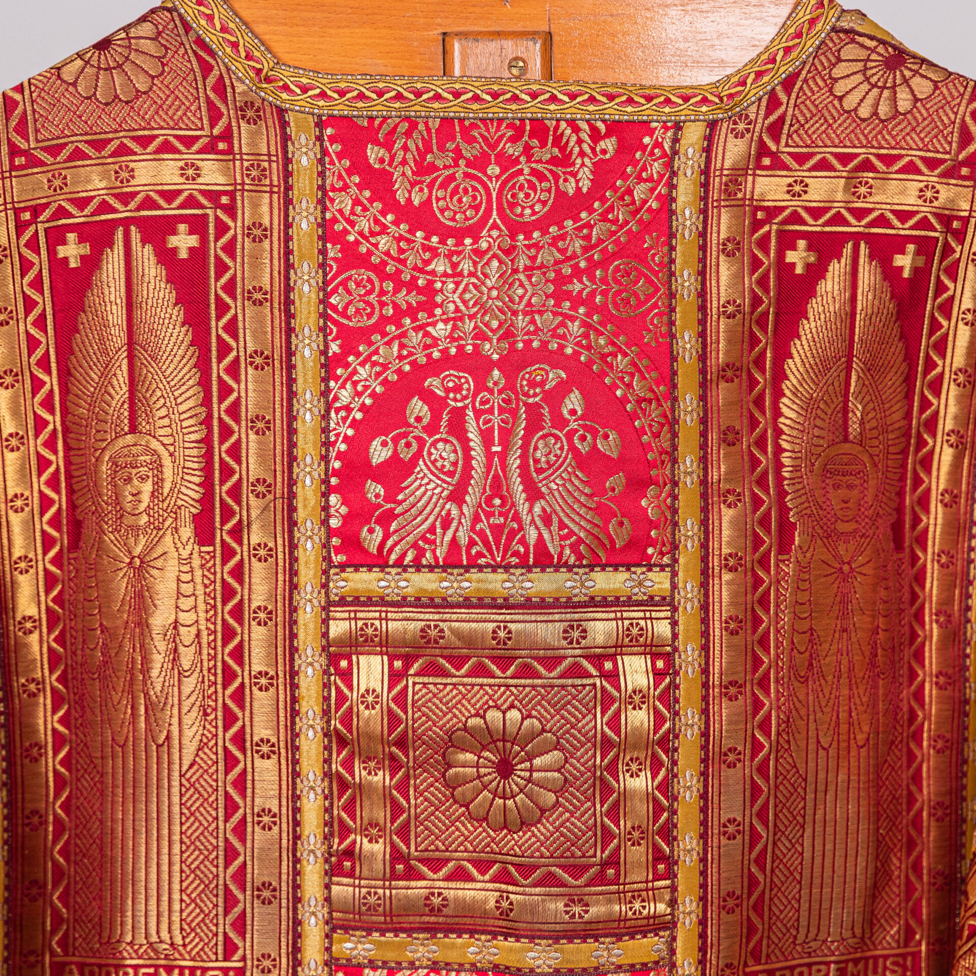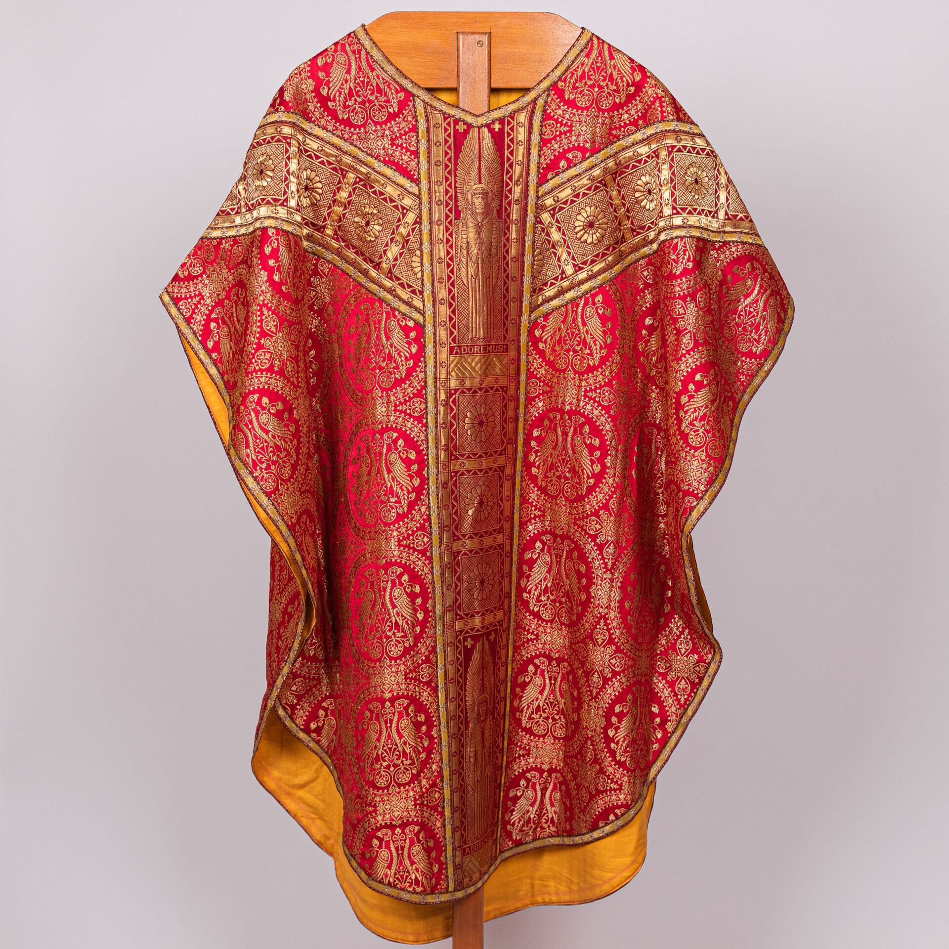 Kazuifel met 2 dalmatieken, 3 stolas, 3 manipels en bursa en velum