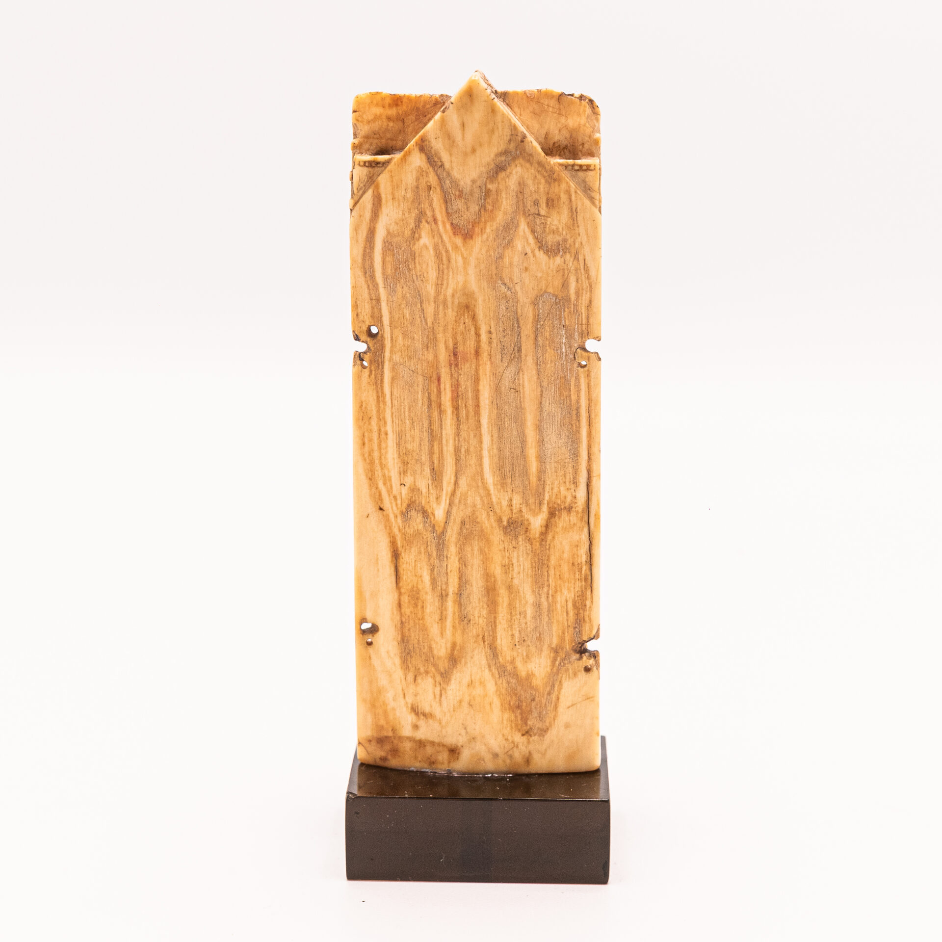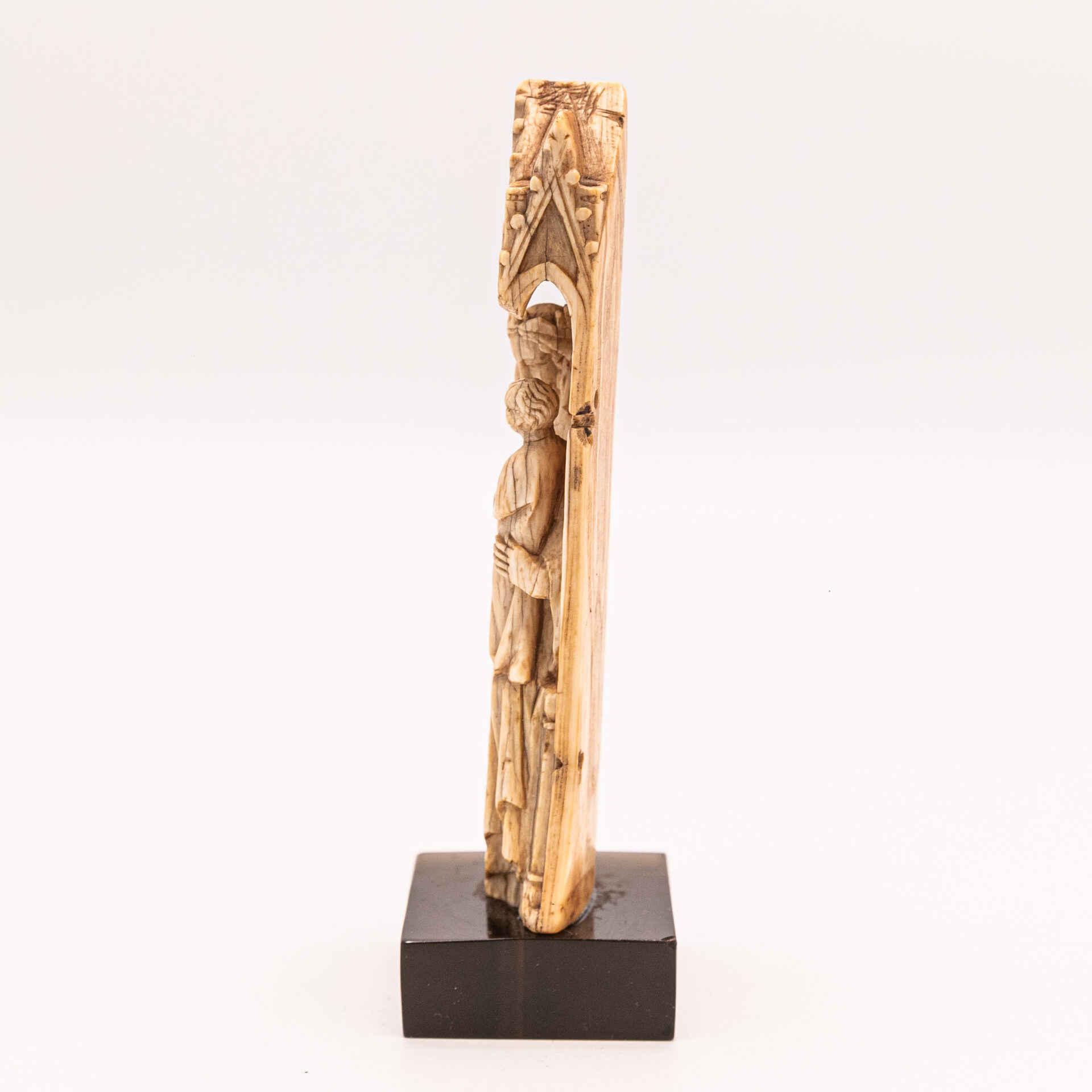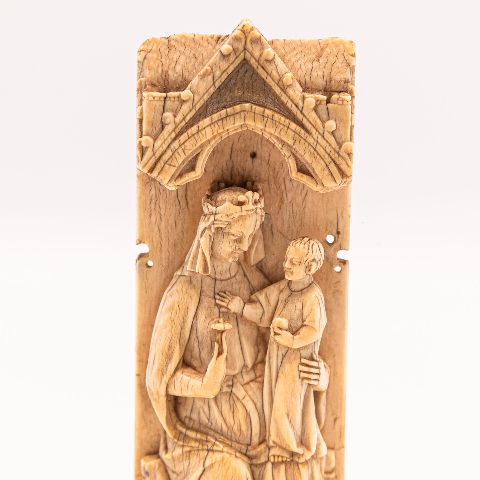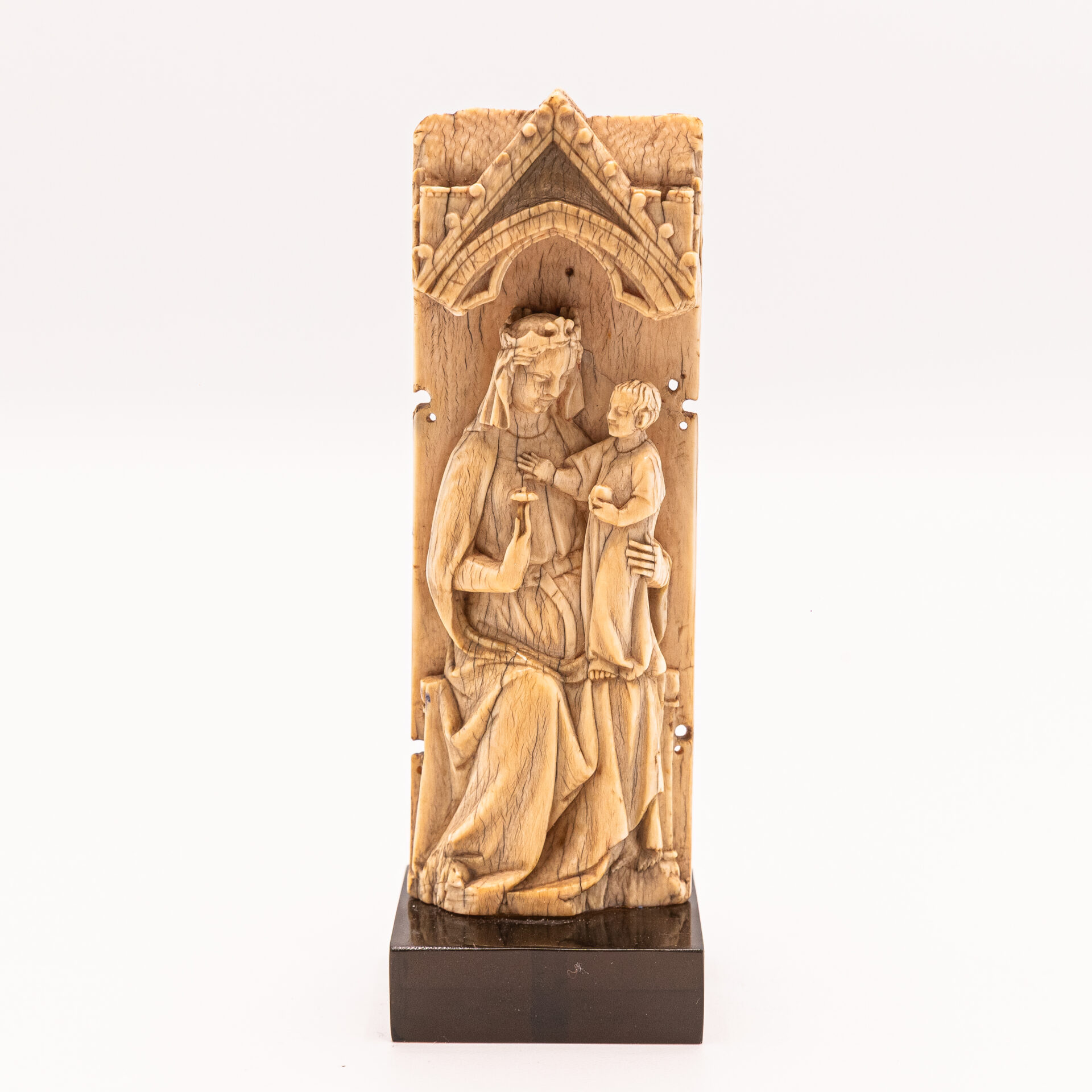 Middendeel van een veelluikje (tabernakeltje). Onder een baldakijn, die aan de drie zijden met een gotische spitsboog versierd is, zit Maria op een lage bank neer. Ze heeft een kroon op het hoofd en is gehuld in een lange mantel die in sierlijke plooien over haar beide knieën neervalt. Terwijl ze in haar rechterhand een bloem ophoudt, ondersteunt ze met haar linkerhand het kind. Deze staat op haar linkerknie recht en houdt in zijn handje een appel. Dergelijke tabernakeltjes fungeerden oorspronkelijk als huis- of reisaltaartje en waren vooral op het einde van de 13e eeuw en in de 14e eeuw populair. Het grote meesterschap van de kunstenaar blijkt vooral uit de vaststelling dat dit object uit één stuk ivoor is vervaardigd en hij het groepje met Maria en Kind bijna los van de achterwand heeft weten vrij te maken. Maar ook de zeer sierlijke rechterhand van Maria, de gezichtjes en het soepele plooienspel verraden een groot talent.