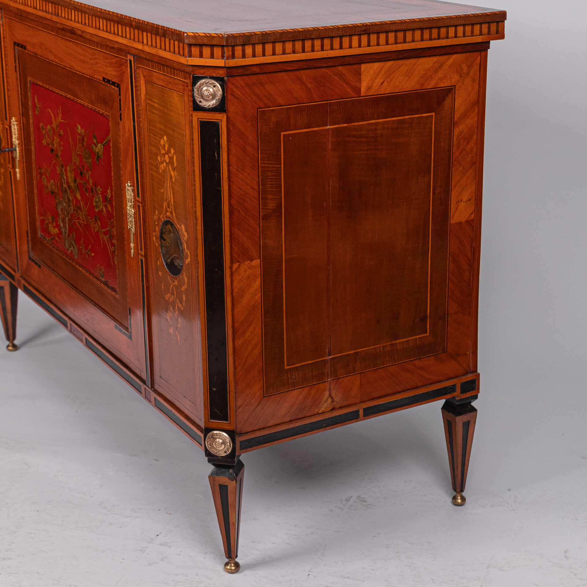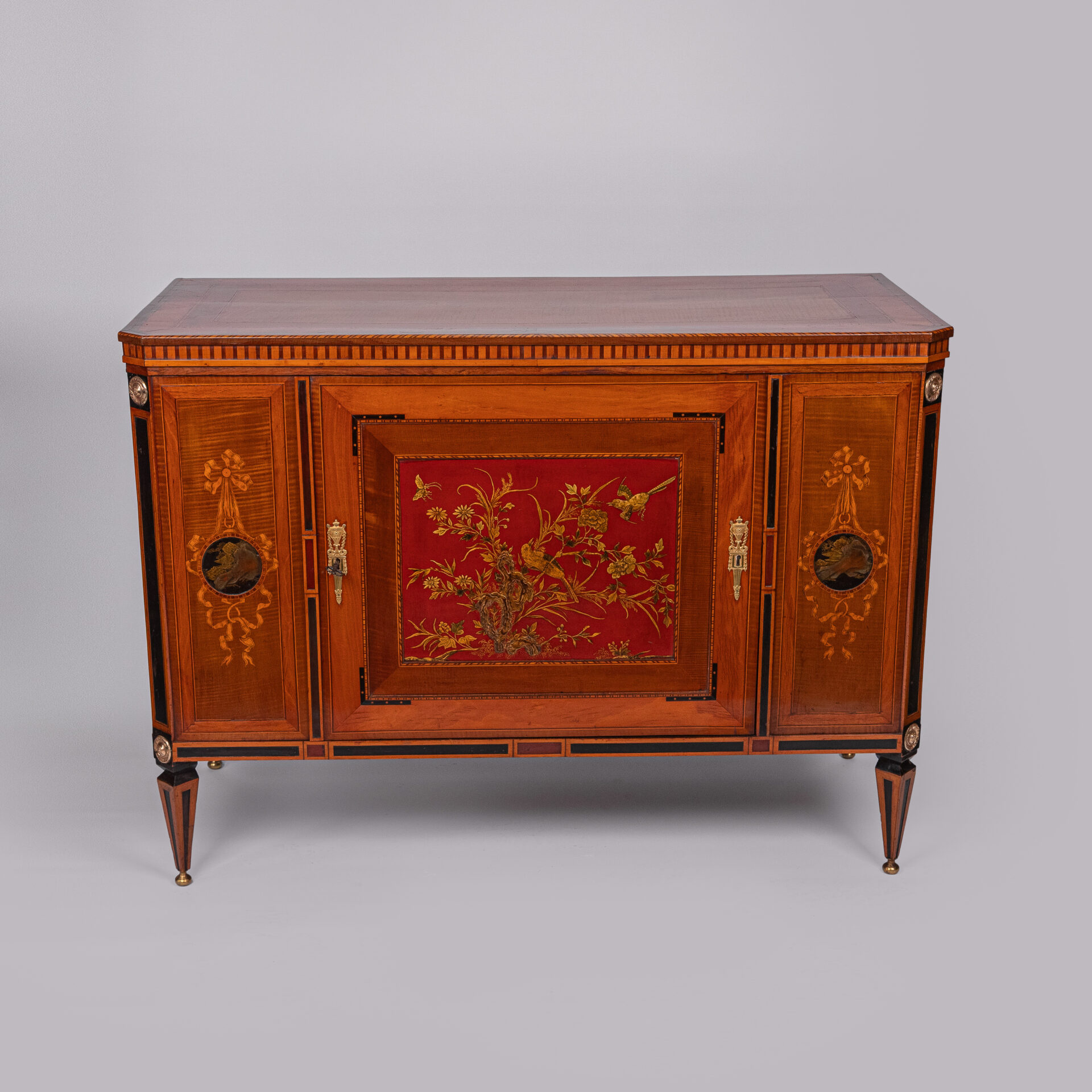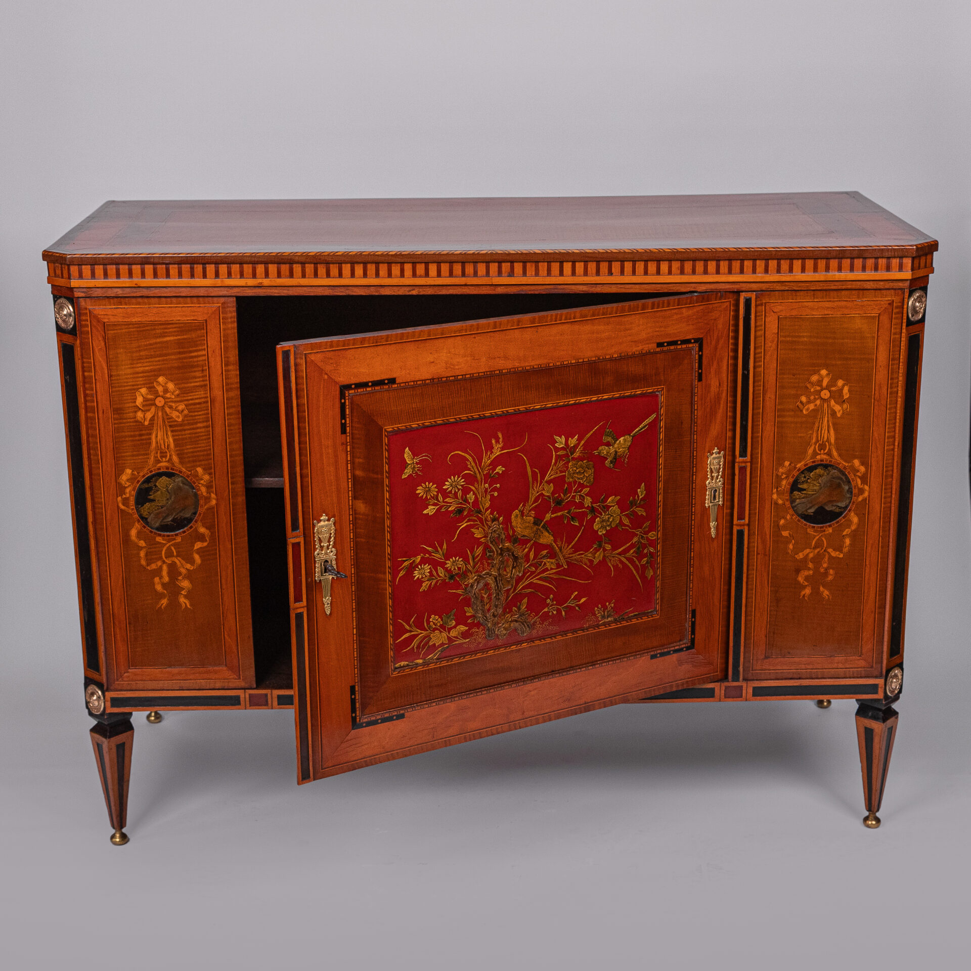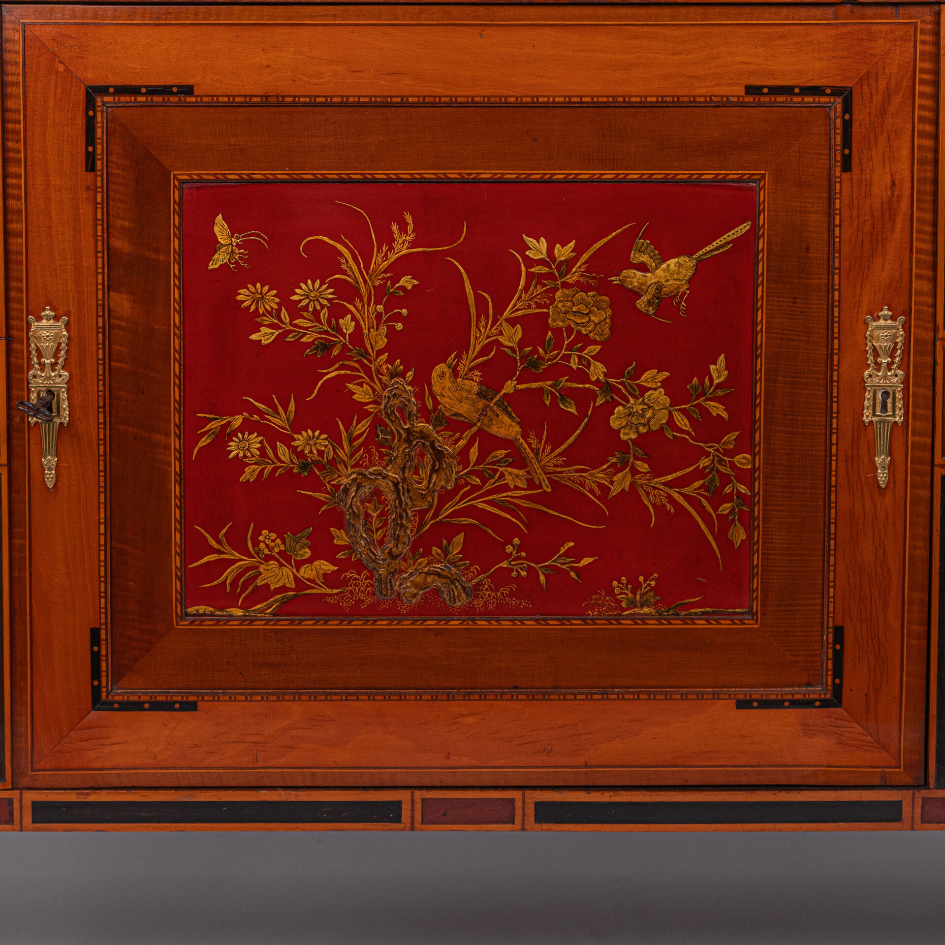 Satijnhouten buffet met ebbenhout. Grote deur aan de voorzijde met rood en goud chinees lakpaneel van vogels en bloeiende struiken. Aan beide buitenzijden zwarte lakpanelen met goud opgehoogd. Vergulde monturen
