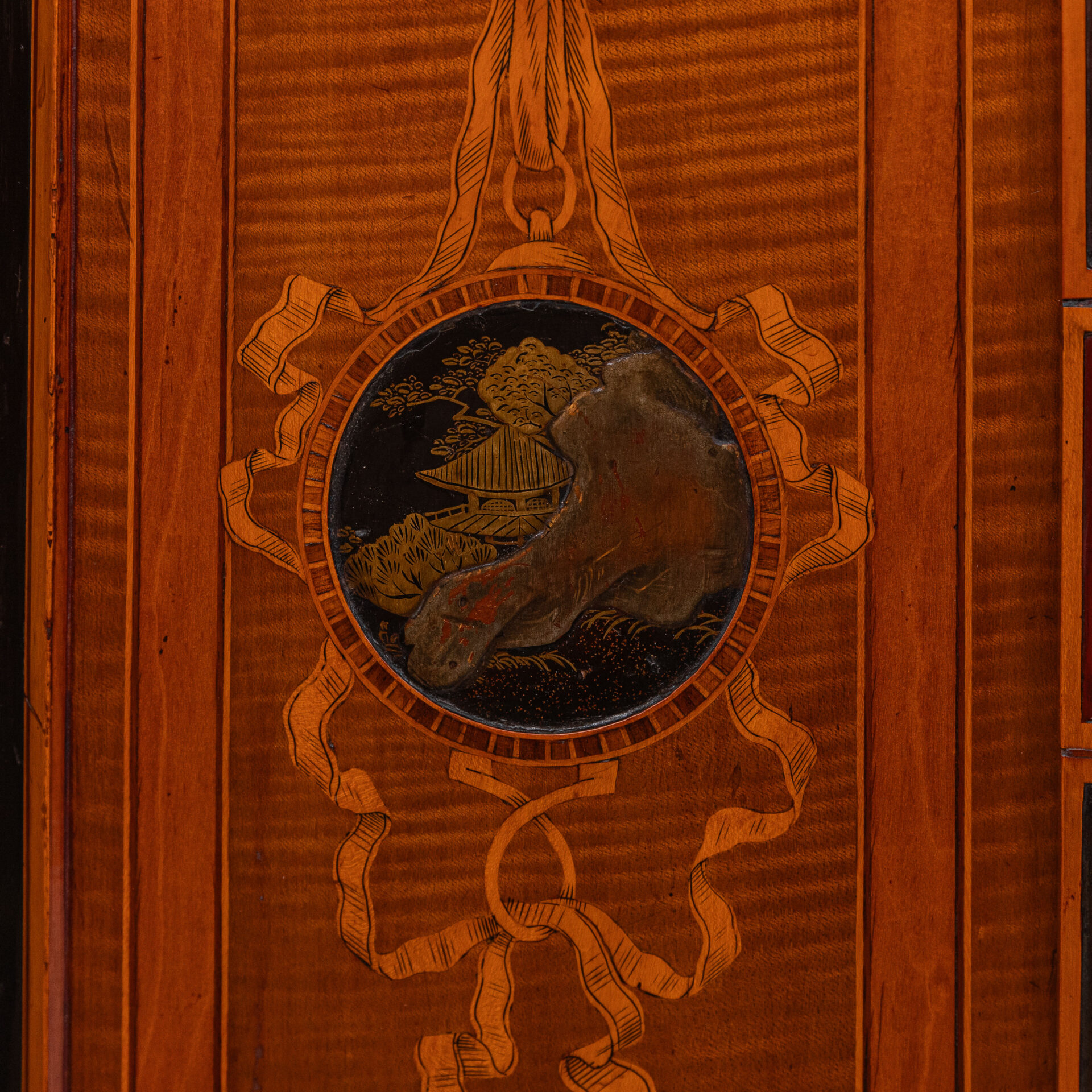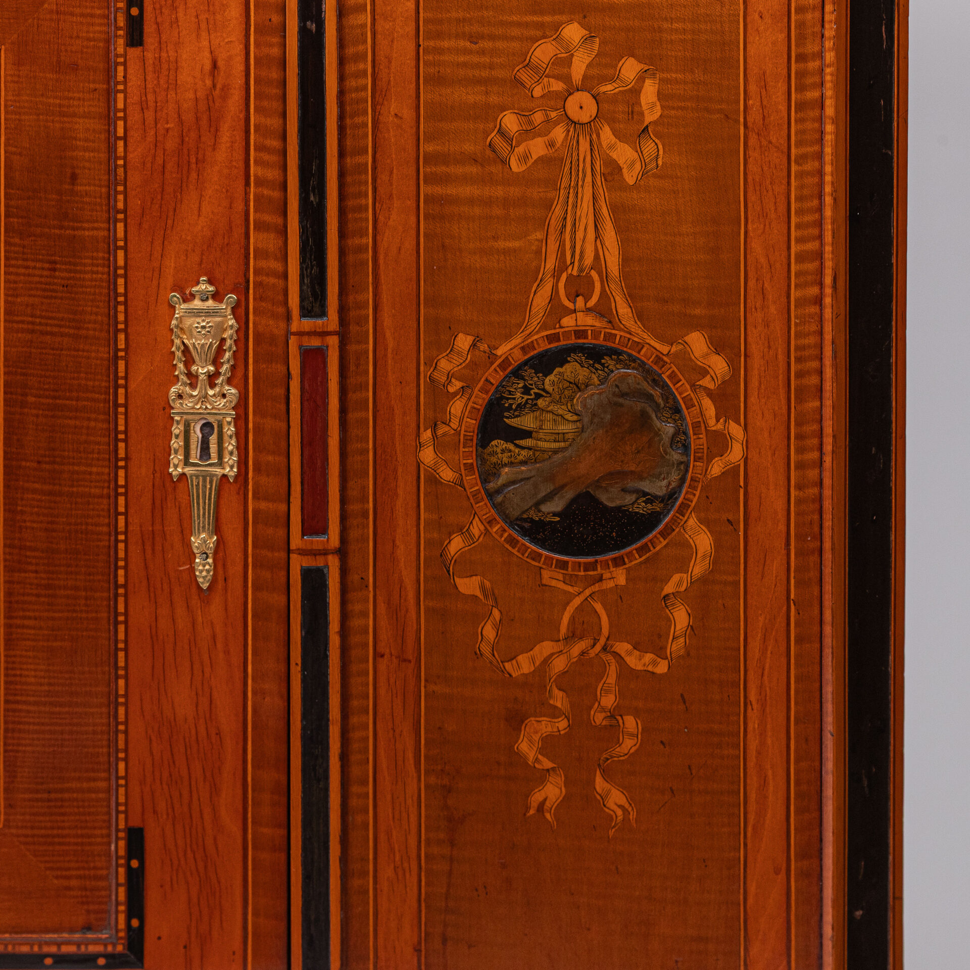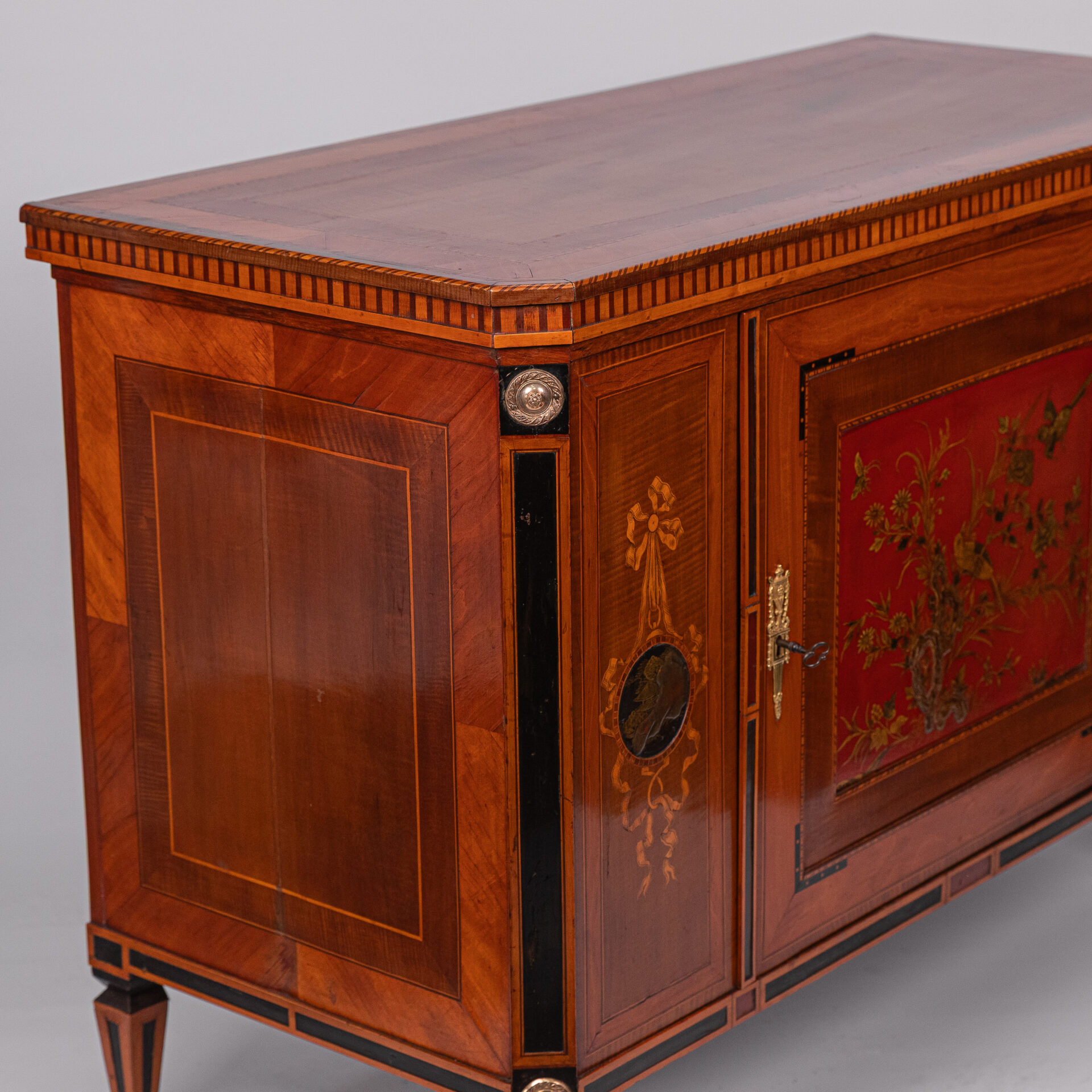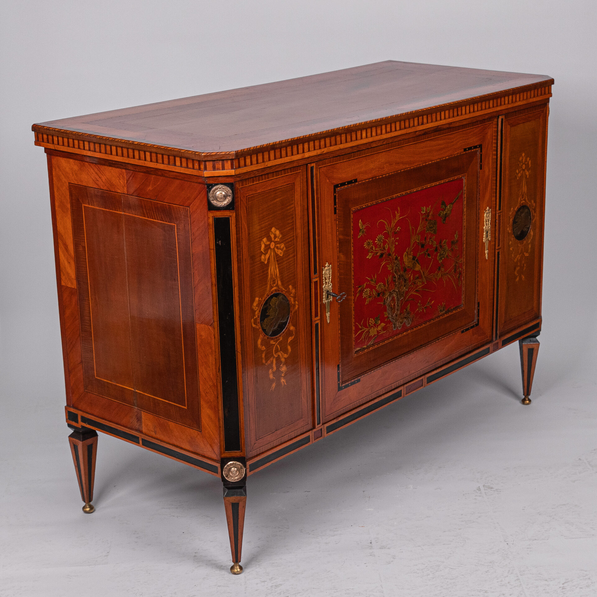 Satijnhouten buffet met ebbenhout. Grote deur aan de voorzijde met rood en goud chinees lakpaneel van vogels en bloeiende struiken. Aan beide buitenzijden zwarte lakpanelen met goud opgehoogd. Vergulde monturen