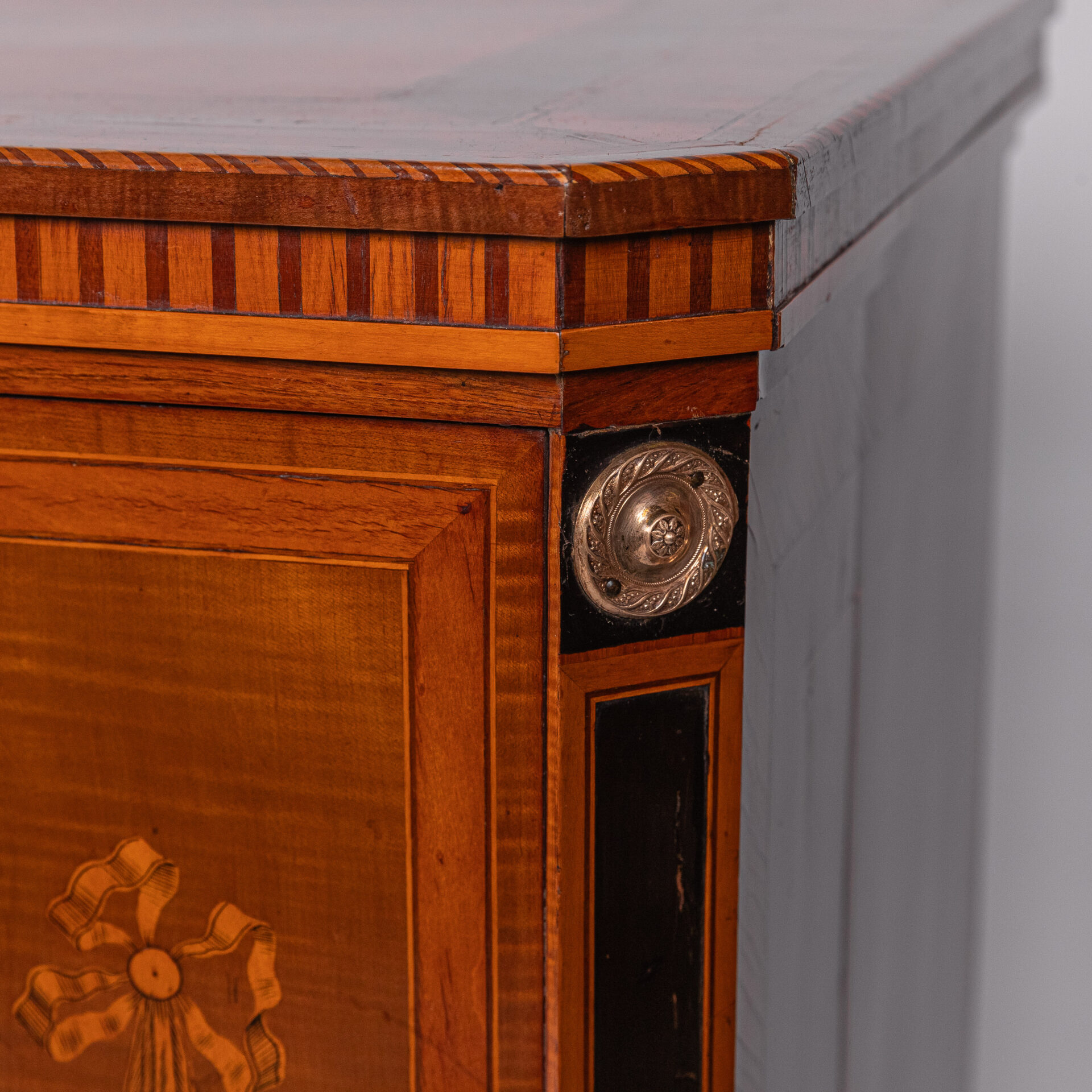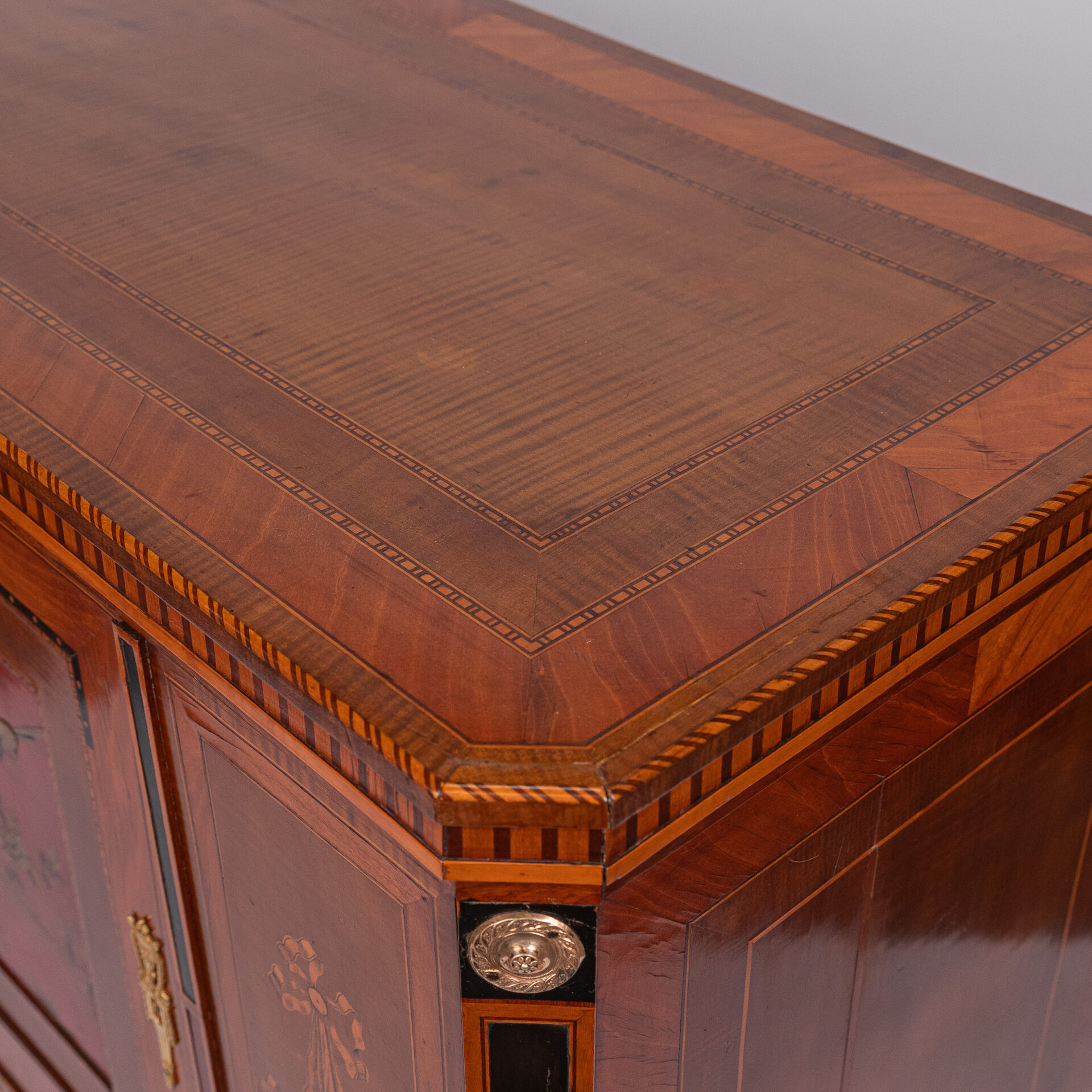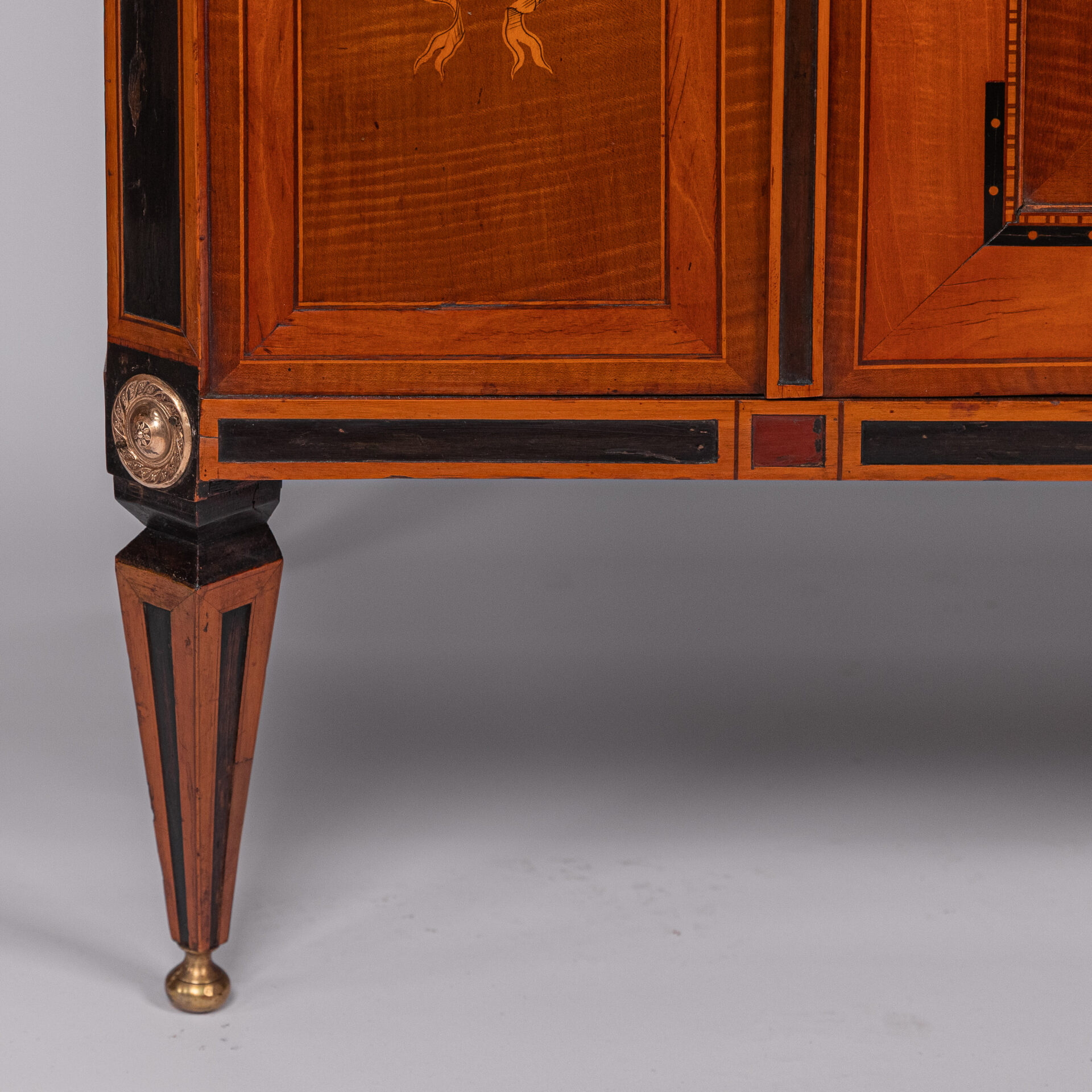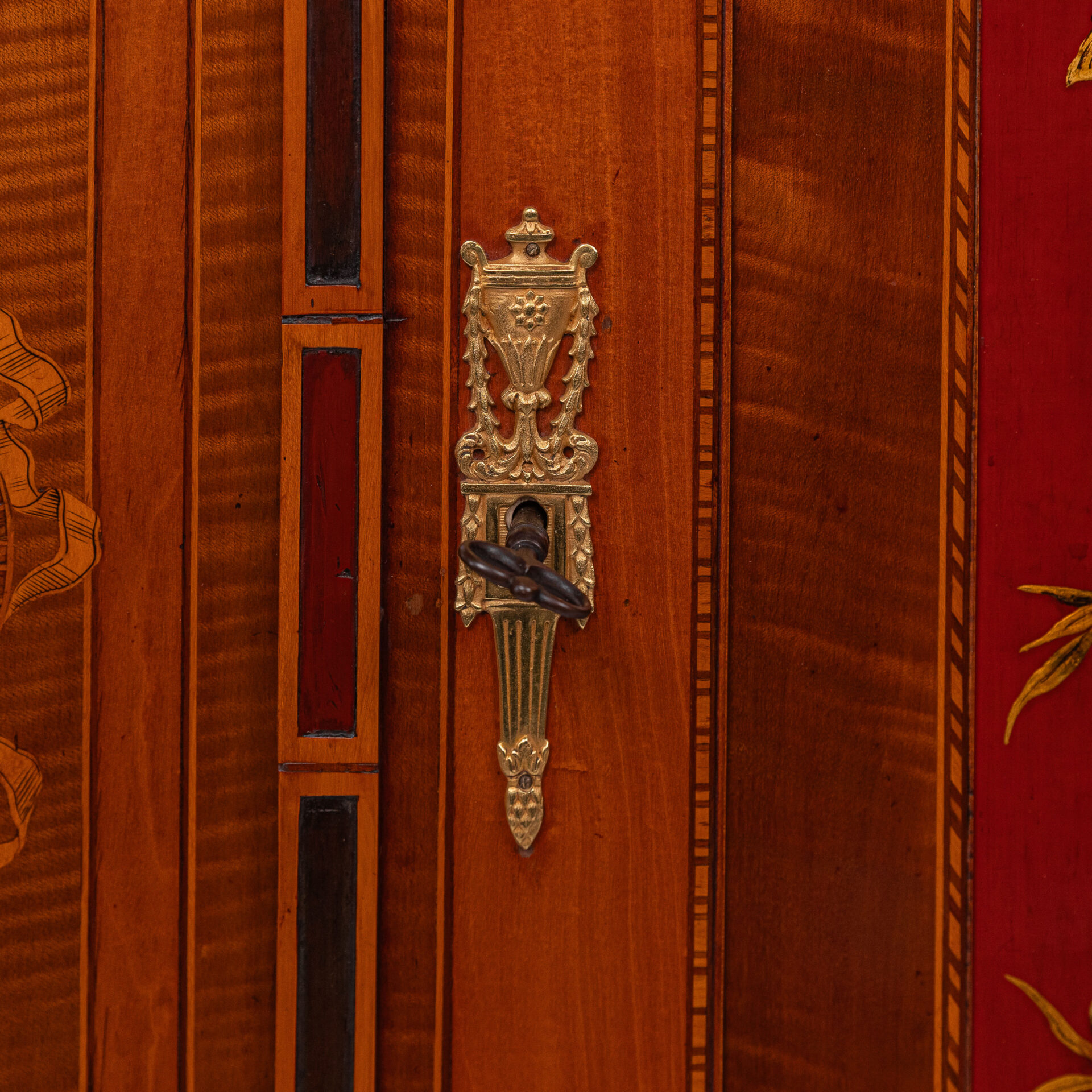 Satijnhouten buffet met ebbenhout. Grote deur aan de voorzijde met rood en goud chinees lakpaneel van vogels en bloeiende struiken. Aan beide buitenzijden zwarte lakpanelen met goud opgehoogd. Vergulde monturen