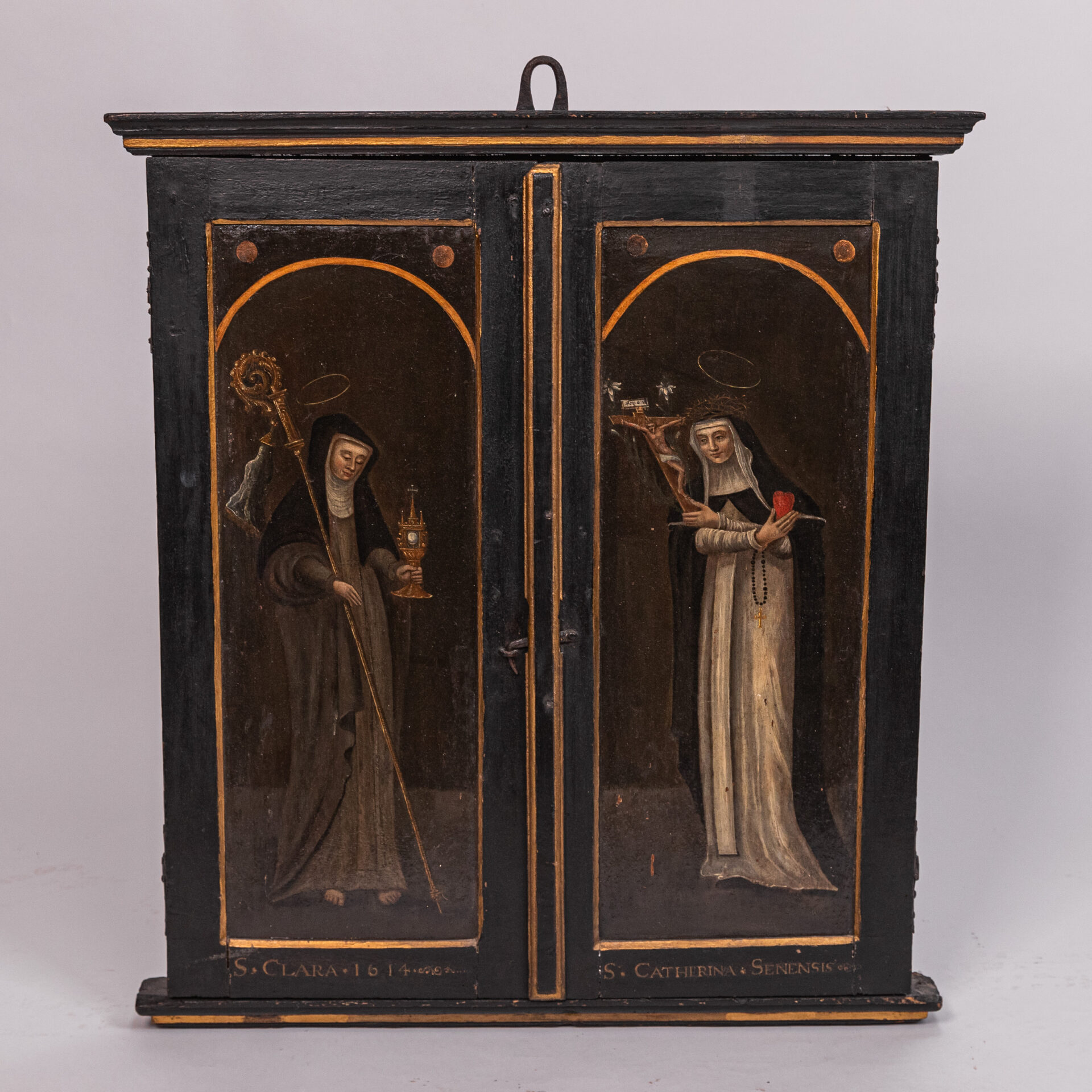 - Description: TRIPTYCH OF THE IMMACULATE CONCEPTION. Oil on Oak. Center panel: height 80 cm. Width 75 cm. Bruges 1614 (date left outer panel) left and right the two figures that Mary knew well: John the Baptist and John the Evangelist. The exterior depicts Saint Clare and Saint Catherine of Siena. In the Center Mary in Halo with the dragon at her feet. Around her invocations from the Laurentane litany, so called because these invocations were printed at Loretto in 1576. The honorific titles of Mary listed here are: Speculum sine macula; Fons signatus; Templum Dei; Hortus conclusus; Quasi Palma; Putaeus Aquorum; Turris Davidica; Civitas Dei.